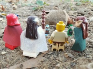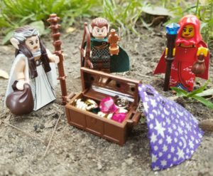 October 22, 2017 | Leave a comment Although they were unable to locate the bandit leader who escaped, the team discovers a large treasure trove containing vast riches, as well as the cloak that will return Joren to his rightful form! Without delay, Melora excitedly shows the scroll to her comrades, who both agree to place the cloak around the tiny statue of Joren. After a few moments the statue begins to glow with a golden light as it morphs back into the form of their cheerful companion! The monk thanks them for breaking the curse and the heroes make their way back to the Dwarven City. On their trip to Thaeris, the adventurers encounter two Littlefolk travelers who approach them cautiously. As they exchange pleasantries, it becomes clear to Areya that they have a settlement nearby but are attempting to conceal that point. After a brief, but amiable interaction, the Littlefolk continue on their way. Back at Regnak’s home, the celebration lasts all night as the heroes revel in victory! After a long and hard road, the team is reunited once again. The dwarf offers them his home for the night and tells them Orlox expects to meet them in the morning. Before she drifts of to sleep, Melora takes some leftovers to feed her fast growing familiar. It hungrily devours the offering and squeals in contentment! After the sorceress leaves, the little dragon helps itself to the scraps left around the dwelling floor. Visit us on Patreon to join the adventure!